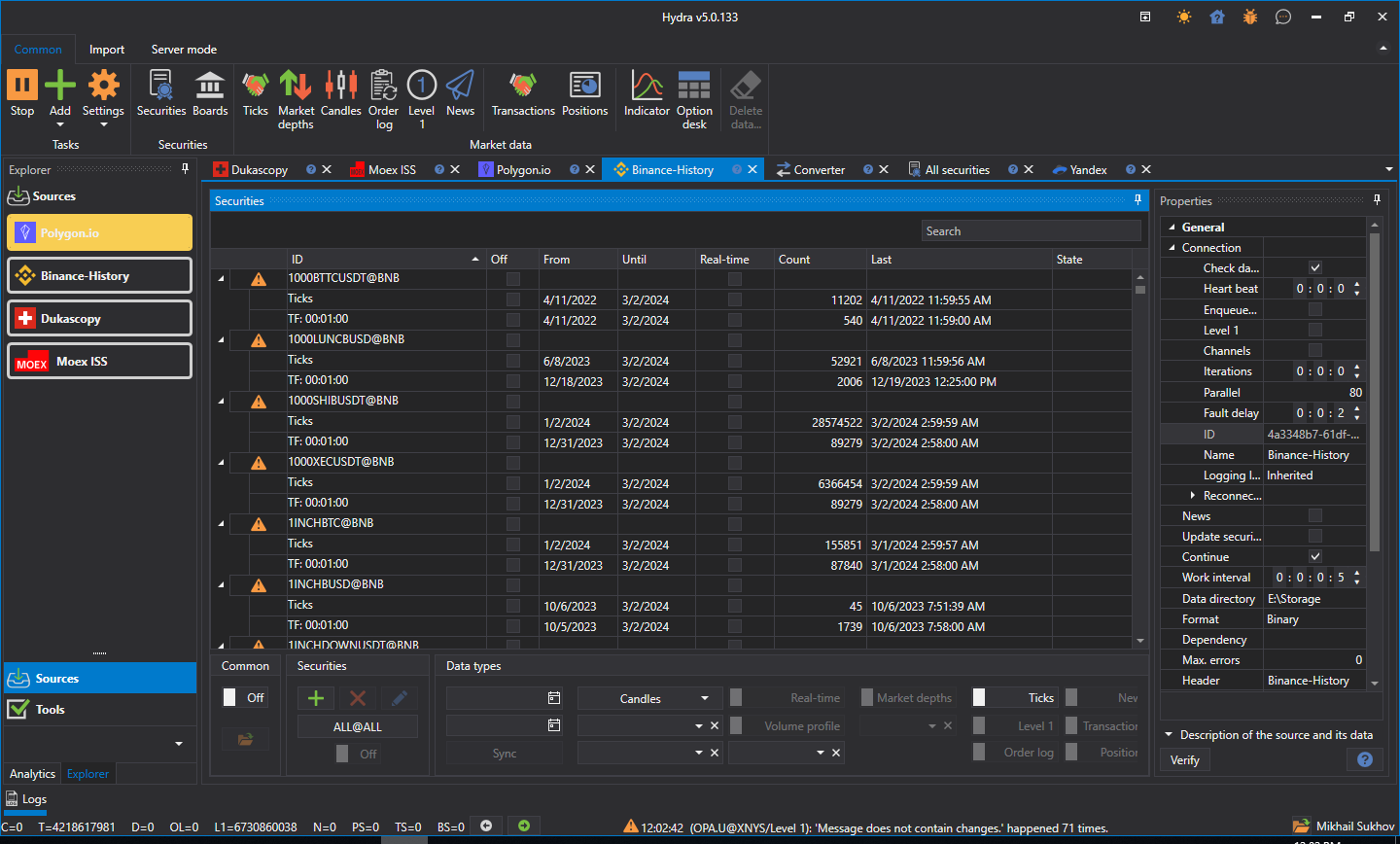 Hello, friends! Despite the summer months, we continue to work on the project and release a new version of Hydra! In the new release, we added many key improvements. Here are some of them: 1. We have added some new sources of historical and market data FXCM, CQG Continuum, FAST. 2. Quik lua. Historical candles. 3. Documentation embedded links. 4. Positions tracking. All information about positions, comissions, margin etc. 5. Depths. Show histogram for volumes 6. Depths and level1. Show spread chart. 7. Ticks pane. Show tick chart 8. Auto importing tool. 9.Symbol mapping manager. Additional info. 10. Indicator values building. Allows you to calculate the indicator values inside Hydra and save them to an external file for further analysis, or visualize using a graph. We invite everyone to download the new version and evaluate the changes yourself. For all newcomers who want to evaluate the full power of the updated S # .API platform, we offer a discount for training course in the amount of 10% before the end of the month! \u003e\u003e Download \u003c\u003c