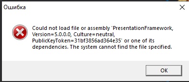 Could not load file or assembly 'PresentationFramework, Version=5.0.0.0, Culture=neutral, PublicKeyToken=31bf3856ad364e35' or one of its dependencies. The system cannot find the file specified