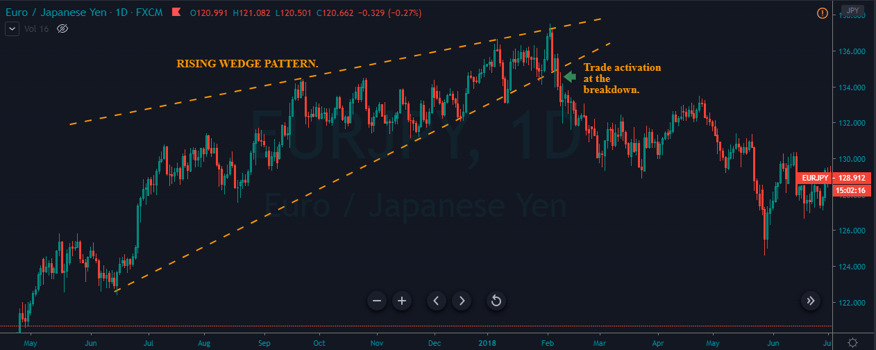 💥The wedge pattern (shown above) is similar to pennants at first glance, but it differs in that the formation of the wedge takes longer than that of pennants. During the formation of a falling wedge, a new low will be formed below the previous low, for example, 3 is below 2 and 2 is below 1. On the other hand, during the formation of a rising wedge during an uptrend, a new high will be formed, and the new high will be higher than the previous high, for example, 3 is higher than 2 and 2 is higher than 1.
