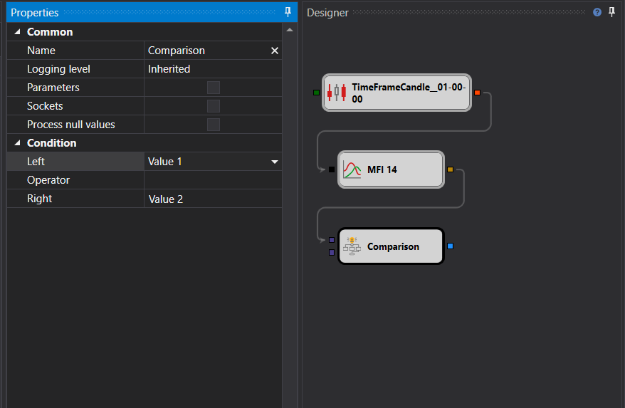 With the comparison object in my screenshot, doing this seems impossible because I cannot select "MFI" for "Value 1".