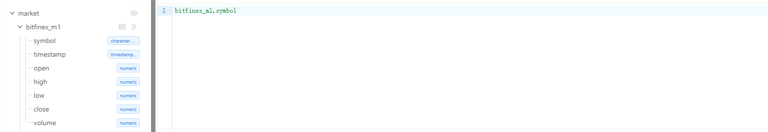 For example, if we select OHLC and then select market->bitfinex_m1, we can see the field names in this table object after clicking Expand.