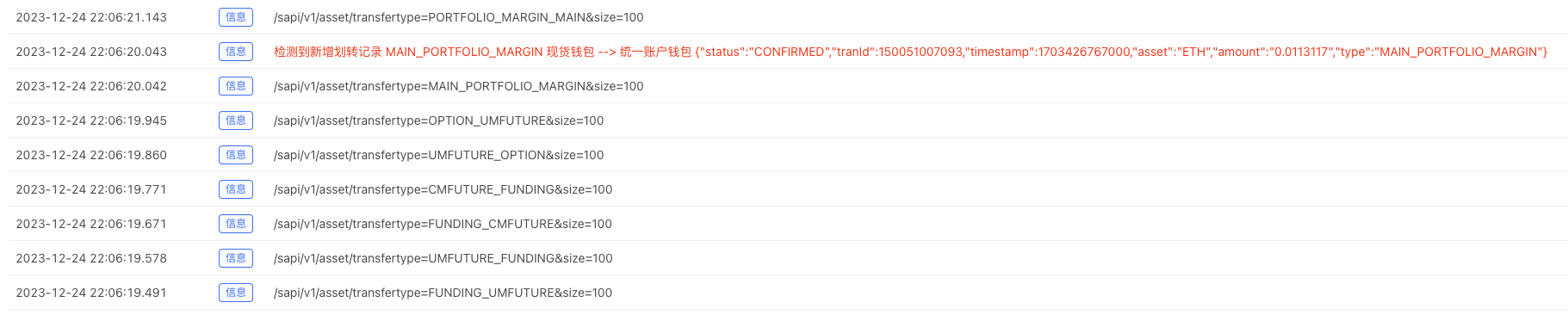 I checked the documentation of Binance exchange and found that there is a transfer history interface that can query all transfer information. Since we are only monitoring transfer records that may occur, we do not need to obtain all transfer history. We only need to check recent transfer records within a certain range based on a certain frequency. If new transfer records are found, they will be updated and notified.