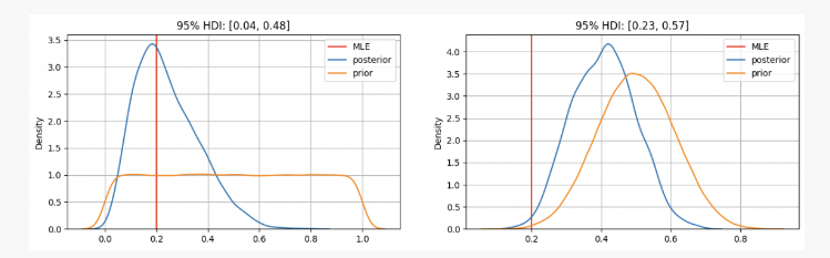 As you can see, in the first case, our prior distribution of parameter ```p``` is concentrated at the maximum likelihood estimate (MLE) ```p=0.2```, which is a method similar to that used by the frequency school. The true unknown parameter will be within the 95% confidence interval, between 0.04 and 0.48.