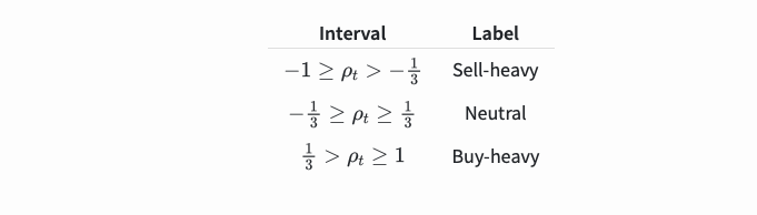https://stocksharp.com/file/149407 represents the transaction volume of the best sell order at time t. We can interpret ρt close to 1 as strong buying pressure, and ρt close to -1 as strong selling pressure. This only considers the transaction volumes of orders placed at the best buy price and best sell price, that is, L1 order book.