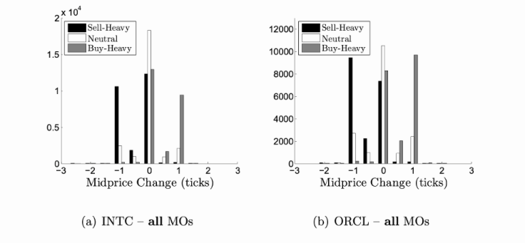 Regarding the predictive ability of volume imbalance, an analysis was conducted on the tick-by-tick order book of a certain commodity from January 2014 to December 2014. For each arriving market order (MO), the volume imbalance was recorded and segmented according to the number of ticks in which the mid-price changed within the next 10 milliseconds. The chart shows the distribution and mid-price changes for each segment. We can see that positive price changes are more likely to occur before order books with greater buying pressure. Similarly, negative changes are more likely to occur before order books with greater selling pressure.
