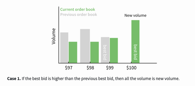 This is a function involving three scenarios. The first scenario is, if the best buying price is higher than the previous best buying price, then all transaction volumes are new transaction volumes.