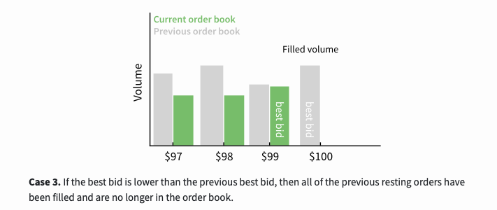 The third scenario is, if the best buying price is lower than the previous best buying price, then all previous orders have been traded and are no longer in the order book.