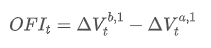 We can calculate the order flow imbalance by looking at how much the trading volumes have moved at best bid price and best ask price. The change in trading volume at best bid price is: