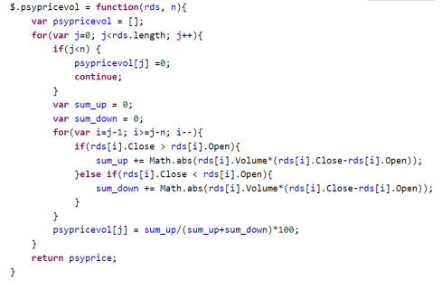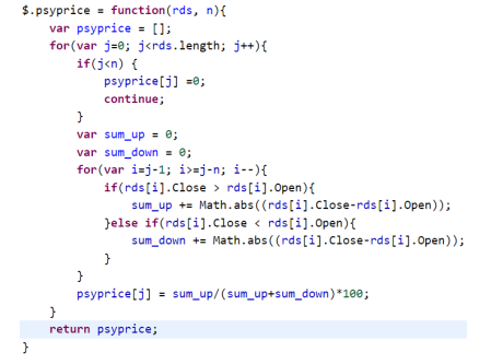The PSY factor is based on the number of days the closing price rises or falls over a period of time. Its calculation method is very simple, and the calculation formula is as follows: PSY=(Number of rising days within N K-lines/N)*100. Here, N period represents the selected calculation period, which can be several days, weeks or months etc. The number of rising days refers to the number of trading days with rising prices within the N period. The initial PSY factor function source code based on FMZ platform: