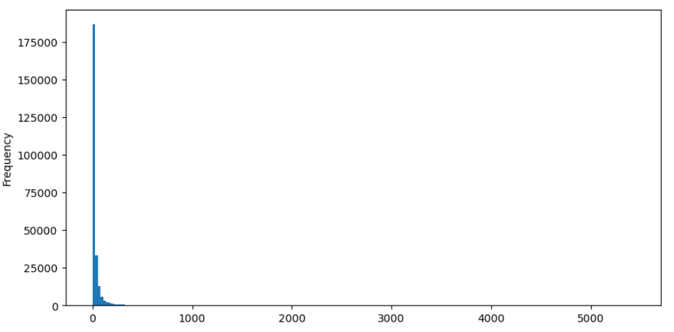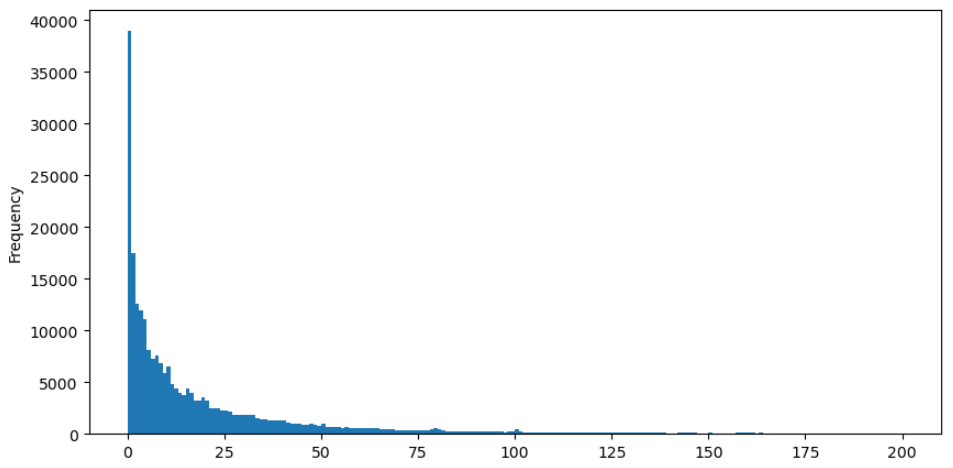 buy_trades['quantity'].plot.hist(bins=200,figsize=(10, 5));