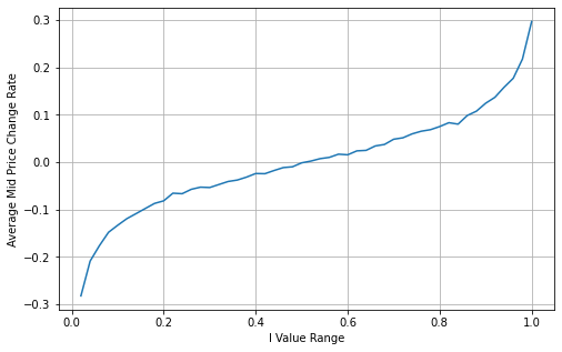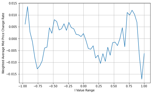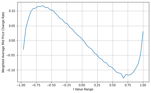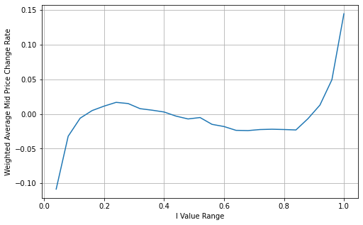 Adjust Weighted Mid-Price:From the graph, it can be observed that the weighted mid-price shows smaller variations compared to different values of I, indicating that it is a better fit. However, there are still some deviations, particularly around 0.2 and 0.8. This suggests that I still provides additional information. The assumption of a completely linear relationship between the price correction term and I, as implied by the weighted mid-price, does not align with reality. It can be seen from the graph that the deviation speed increases when I approaches 0 and 1, indicating a non-linear relationship.
