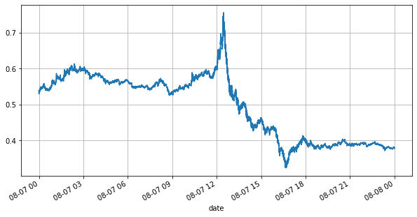 books['best_bid_price'][::10].plot(figsize=(10,5),grid=True);