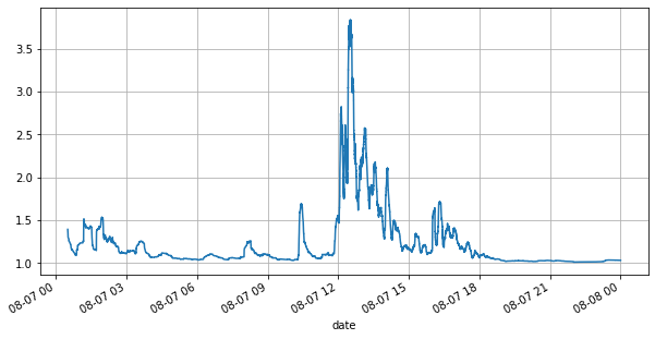 (books['spread'][::10]/tick_size).rolling(10000).mean().plot(figsize=(10,5),grid=True);