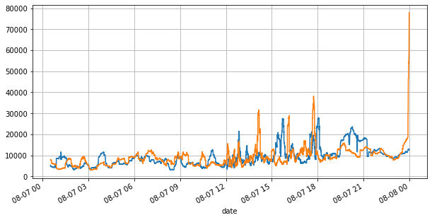 books['best_bid_qty'][::10].rolling(10000).mean().plot(figsize=(10,5),grid=True);