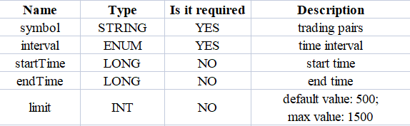 // GET https://fapi.binance.com /fapi/v1/klines symbol , interval , startTime , endTime , limit