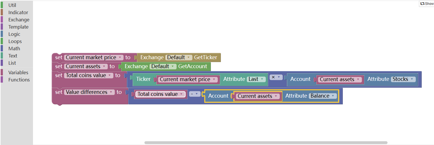As shown in the chart above, the same program needs only one line of code in blockly visual programming, which reduces the programming threshold greatly, especially for those traders who do not understand programming at all. This is a very good operating experience. The FMZ Quant visual programming is also realized through the blocky visualization tool released by Google. In design, it is the same as the Scratch launched by Massachusetts Institute of Technology, so there is really - no barrier.