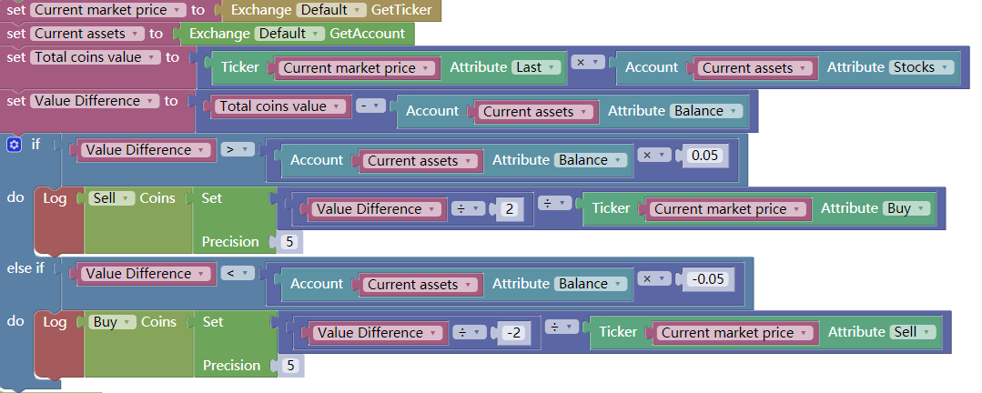 After the assignment of prerequisites and prerequisites is completed, the trading logic needs to be written. This is not as complicated as expected. It is nothing more than to express the above strategy logic in the form of code blocks. That is, if the asset difference is less than 5% of the negative available balance, buy it, and if the asset difference is greater than 5% of the available balance, sell it. As shown below: