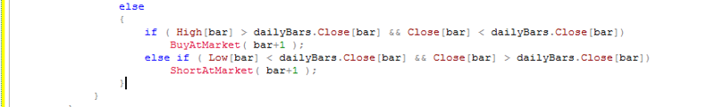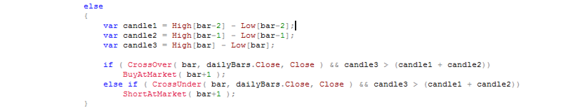 Истинность пробоя можно определить по объему, то есть, если пробой прошел на больших объемах нежели предыдущие бары, нужно считать его истинным. Тут конечно можно наколдовать массу кода. К примеру взять скользящую построенную на объёме или какой-либо другой индикатор. Но мы пойдём самым лёгким путём и просто будем сравнивать текущий объём с предыдущим, и если текущий объём меньше предыдущего то мы не входим в сделку считая такой сетап некорректным.